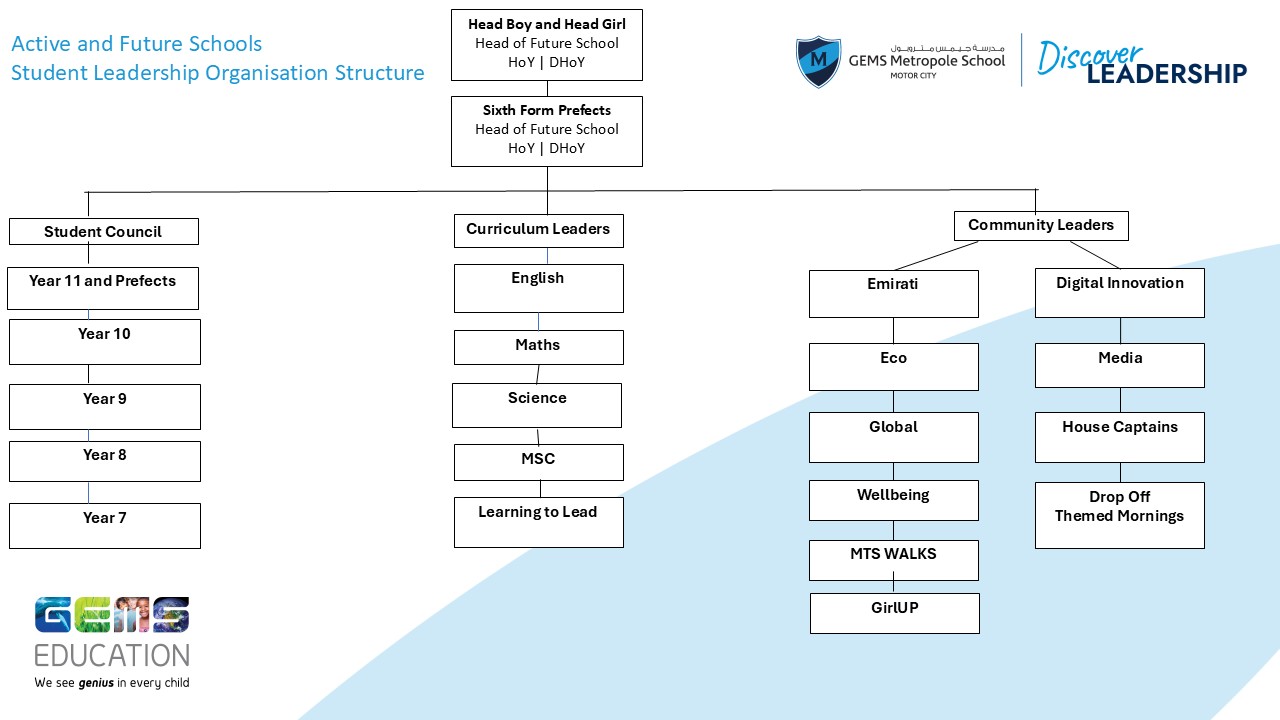 - Leadership is part of everyday life at the Active and Future Schools at Metropole. It is woven into our curriculum and supported through a wide range of opportunities, including the elected student leadership committees. Whether in the classroom, through student-led initiatives, or across the wider school community, students are encouraged to take initiative, share their voice and make a positive difference.