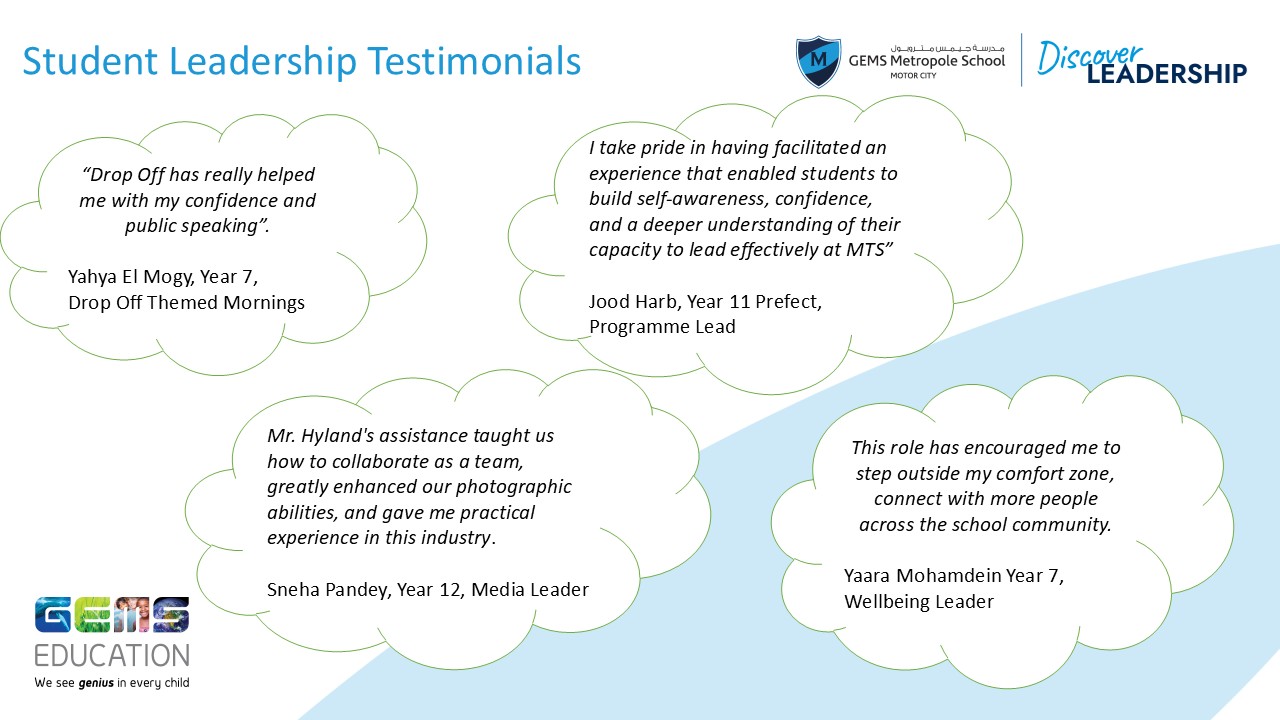 Student Leaders will debate issues and will have a ‘real voice’ in the decision-making processes within school. Furthermore, students will discuss a wide range of important topics, issues and initiatives. Students will develop their debating, planning and people skills in this role, and will also understand the importance of democracy. Students will represent their peers to create positive change for all members of the GEMS Metropole Community.