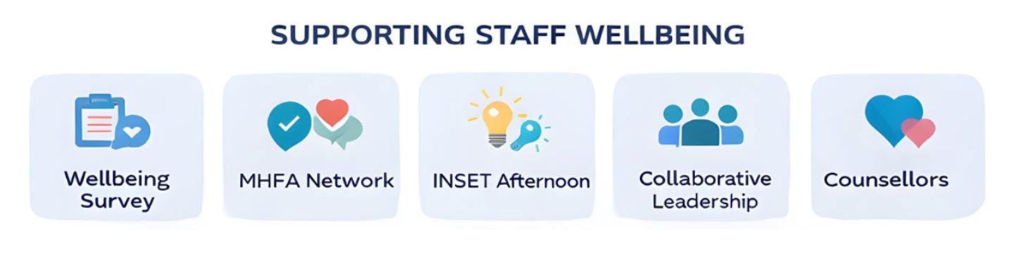 We recognise that supporting staff wellbeing is essential to creating a positive learning environment for students. Staff wellbeing is monitored through surveys, professional dialogue and leadership review. Feedback helps leaders identify areas where additional support may be needed. Our Mental Health First Aid network provides trained staff who can offer guidance and support to colleagues. Staff also benefit from professional development opportunities focused on wellbeing, safeguarding and inclusive practice. Leaders work to maintain a supportive culture where staff feel valued, respected and able to perform at their best. By supporting staff wellbeing, we strengthen the stability and care that benefit the whole school community.